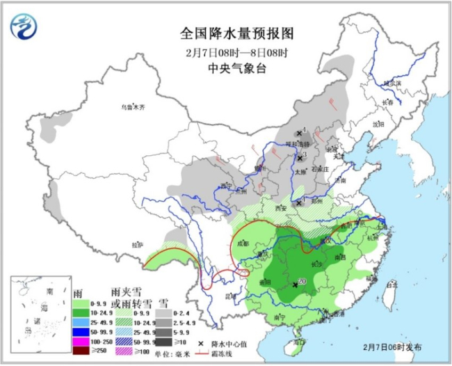 7日08时至8日08时,西藏西部和东北部、西北地区中东部、内蒙古中东部、华北中西部、黄淮西部、江汉中北部等地部分地区有小到中雪或雨夹雪;西南地区东部、江汉南部、江南、华南等地有小到中雨或阵雨(见图3)。