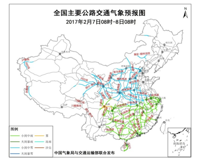 图6 全国主要公路交通气象预报图(7日08时-8日08时)