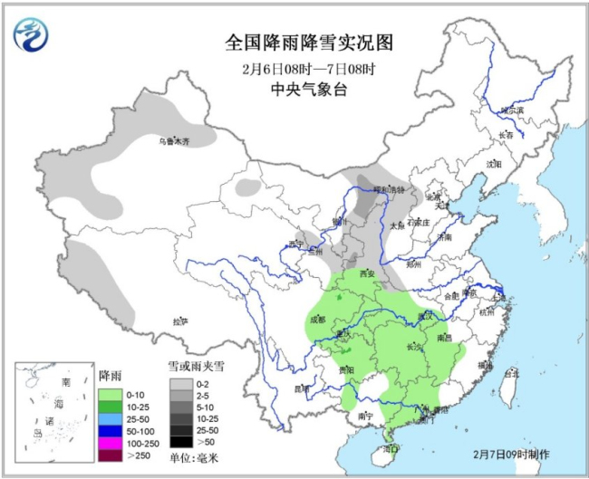 图1 全国降雨降雪实况图(6日08时至7日08时)