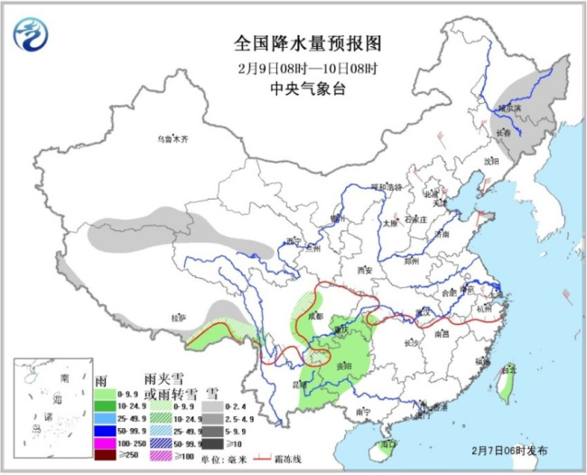 7日至9日,中东部自北向南将出现大风降温和雨雪天气。大部地区平均气温将下降4℃以上,青海东部、陕西北部、内蒙古中部、山西北部、贵州东南部、湖南中南部、江西中南部、福建西部、广西北部和广东北部等地气温将下降8℃以上,局地超过10℃。长江以北地区并伴有4~6级偏北风,东部和南部海区风力有7~9级。9日凌晨,最低温度0℃线将位于长江中游至江南东北部,江南南部和华南北部最低气温将达到4~8℃(见图2),中央气象台2月7日06时继续发布寒潮蓝色预警。7日至8日夜间,西北地区中东部、华北大部将有小到中雪,陕西关中及江汉中北部、江淮北部等地有雨夹雪或雨夹雪转雪,内蒙古中部等地局地有大雪;西南地区东部、江淮南部、江南和华南等地有小到中雨。