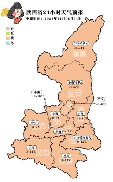 陕西省气象台2021年11月06日(今天)10时52分发布寒潮黄色预警信号:预计下述地区未来24小时内最低气温将下降10℃以上,最低气温≤4℃,平均风力可达5级以上:西安市灞桥区、未央区、阎良区、临潼区、高陵区、周至县、新城区、碑林区、莲湖区、雁塔区、长安区、蓝田县、鄠邑区,铜川市印台区、耀州区、宜君县,宝鸡市渭滨区、陈仓区、岐山县、扶风县、眉县、凤县、凤翔区、太白县,咸阳市秦都区、渭城区、三原县、乾县、礼泉县、永寿县、武功县、兴平市,杨凌杨陵区,渭南市白水县、富平县、临渭区、华州区、潼关县、大荔县、合阳县、澄城县、蒲城区、韩城市、华阴市,延安市宝塔区、延长县、富县、洛川县、宜川县、黄龙县,汉中市宁强县、略阳县、汉台区、南郑区、城固县、洋县、西乡县、勉县、镇巴县、留坝县、佛坪县,安康市汉滨区、汉阴县、石泉县、宁陕县、紫阳县、岚皋县、平利县、镇坪县、旬阳市、白河县,商洛市商州区、洛南县、丹凤县、商南县、山阳县、镇安县、柞水县,另外延安大部、关中北部最低气温还将下降8℃,请注意防范。