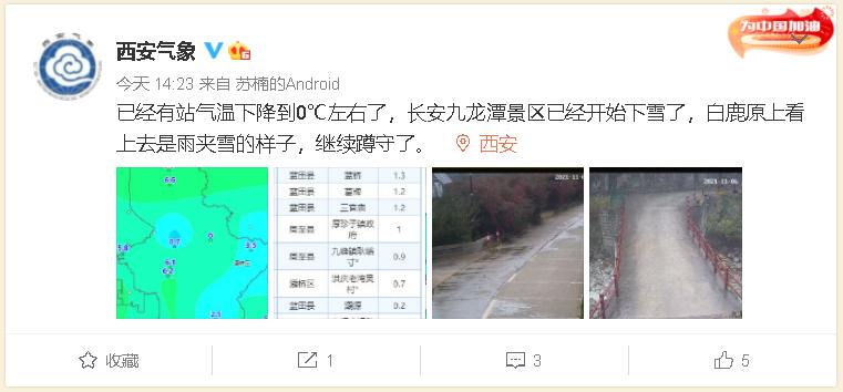 预计未来 12 小时内长安区、蓝田县、周至县、鄠邑区、灞桥区、临潼区的南部山区今天白天到晚上有降雪天气,路表温度低于0℃,可能出现对交通有影响的道路结冰,请注意防范。