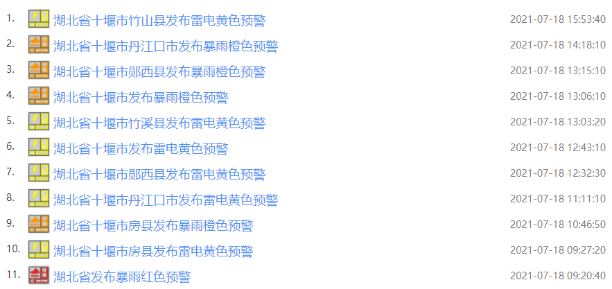 襄阳市气象台2021年07月18日15时04分发布雷电黄色预警信号:预计未来6小时,襄阳市区、襄州、老河口、谷城有雷电活动,局部雨量30-50毫米,阵风6-8级,请注意防范。