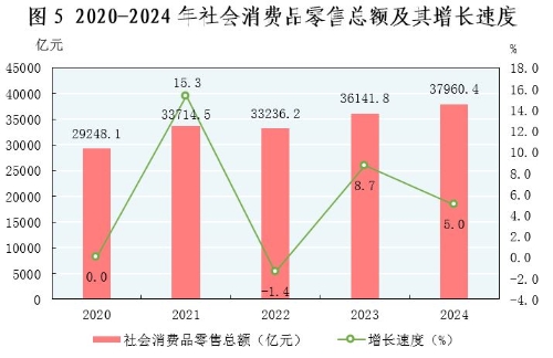 全年社会消费品零售总额37960.4亿元,比上年增长5.0%。其中,餐饮收入4680.7亿元,增长7.7%;商品零售额33279.7亿元,增长4.7%。城镇消费品零售额31842.8亿元,增长4.9%;乡村消费品零售额6117.6亿元,增长5.8%。