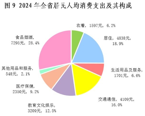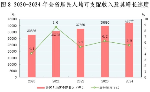 全年全省居民人均可支配收入42077元,比上年增长5.5%。其中,城镇居民人均可支配收入54062元,增长4.8%;农村居民人均可支配收入25257元,增长6.2%。全省居民人均消费支出25645元,增长5.6%。其中,城镇居民人均消费支出31625元,增长4.5%;农村居民人均消费支出17253元,增长7.3%。全省居民人均住房建筑面积43.7平方米。