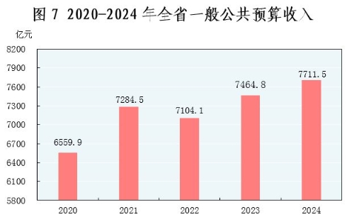 全年全省一般公共预算收入7711.5亿元,比上年增长3.3%。其中,税收收入5039.6亿元,下降3.6%。一般公共预算支出13077.2亿元,增长3.9%。其中,民生支出10368亿元,占财政支出的比重为79.3%。交通运输、城乡社区、农林水等支出增长较快。