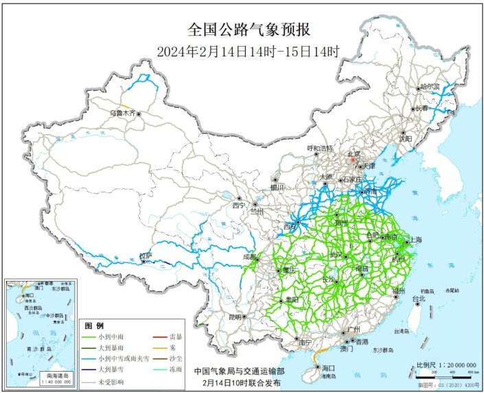 预计14日中午至15日中午,山西南部、吉林东部、黑龙江东南部、山东中东部、川西高原中北部、西藏东部和南部、陕西中南部、青海南部、新疆北部等地部分道路受小到中雪或雨夹雪影响,西藏东部局部路段受大雪影响;黄淮大部、江淮、江汉、江南大部、广西北部、重庆中东部、四川盆地、贵州中东部等地部分道路受小到中雨影响,河南东南部局部路段受大雨影响。另外,广东西南部、广西南部、新疆北部等地部分道路受雾影响能见度低(见图3和附件1)。