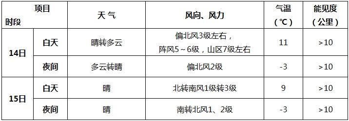 预计,14日至15日北京为晴到多云天气。14日白天受弱冷空气影响,有3级左右偏北风,阵风5~6级,山区阵风7级左右,大气扩散条件和能见度转好。期间白天最高气温9~11℃,夜间最低气温-3℃左右。