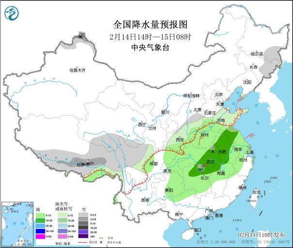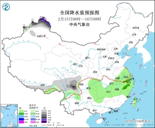 图1 全国降水量预报图(2月14日14时-15日08时)