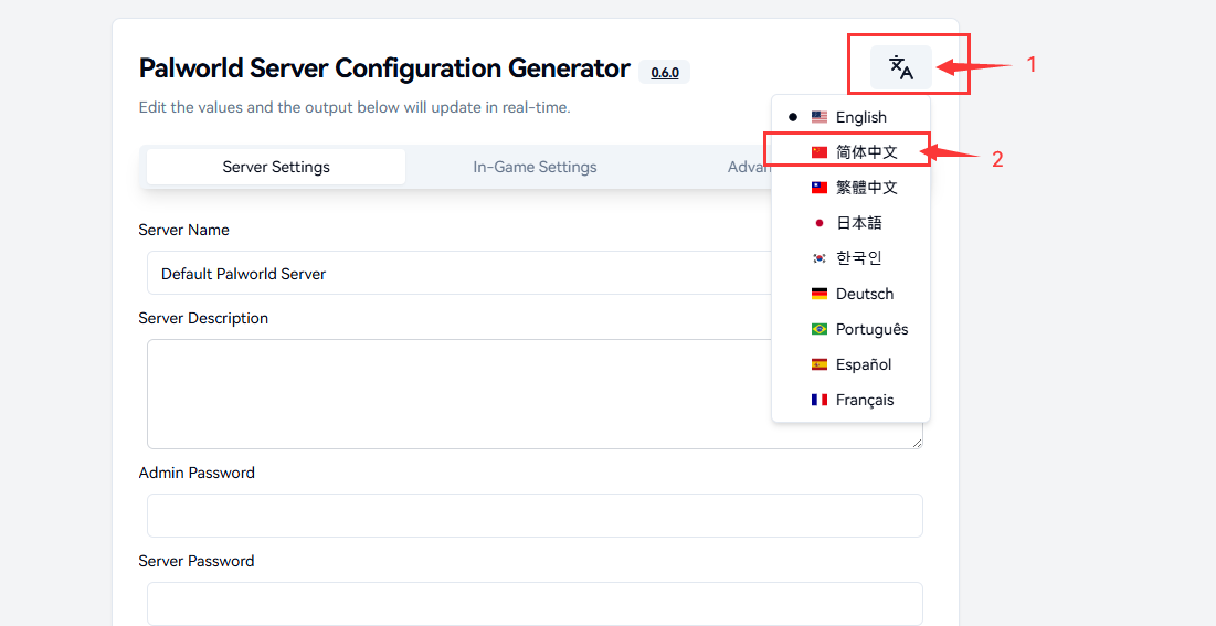 第一步,生成帕鲁配置文件首先访问 幻兽帕鲁服务器配置生成器 网站:点击前往