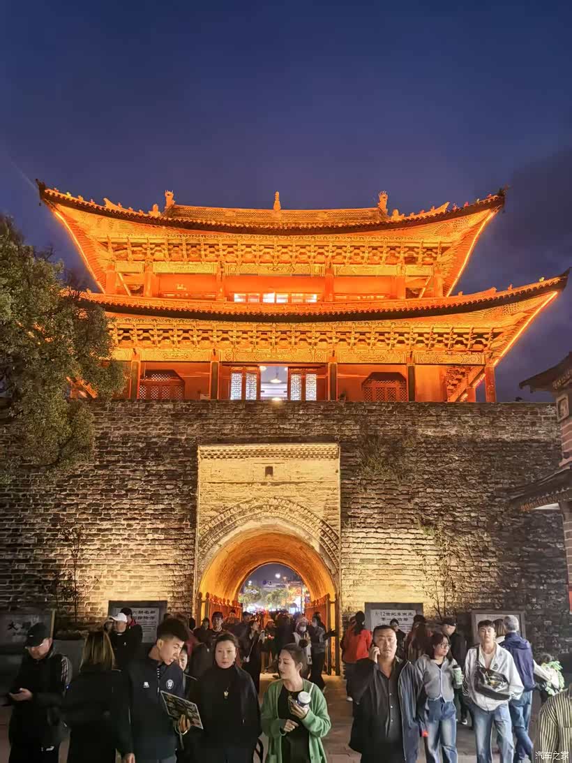 吃完,在古城看夜景。晚上的古城热闹非凡,各种口音的人都有,年龄大的多是跟团游的,住在城外,年轻人都住城里客栈,吃烧烤喝啤酒,享受生活的美好!夜幕降临,华灯初上,古城的繁华才刚刚开始。