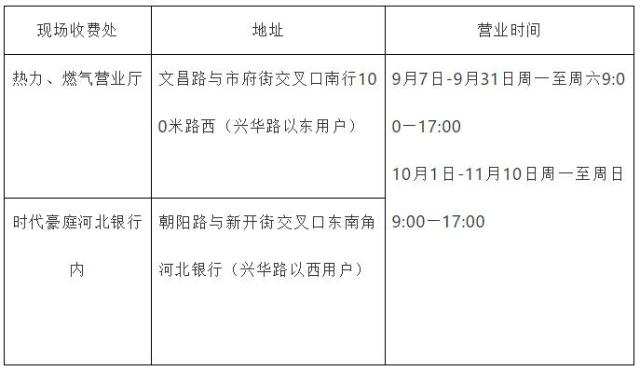 (1)现场缴费(具体地址及营业时间见附件一),用户如有供热缴费卡,可就近缴费;