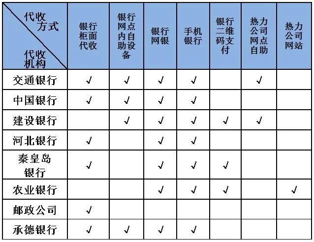 市热力有限责任公司已与交通银行、中国银行、河北银行、秦皇岛银行、承德银行、建设银行、农业银行、邮政公司合作代收取暖费。
