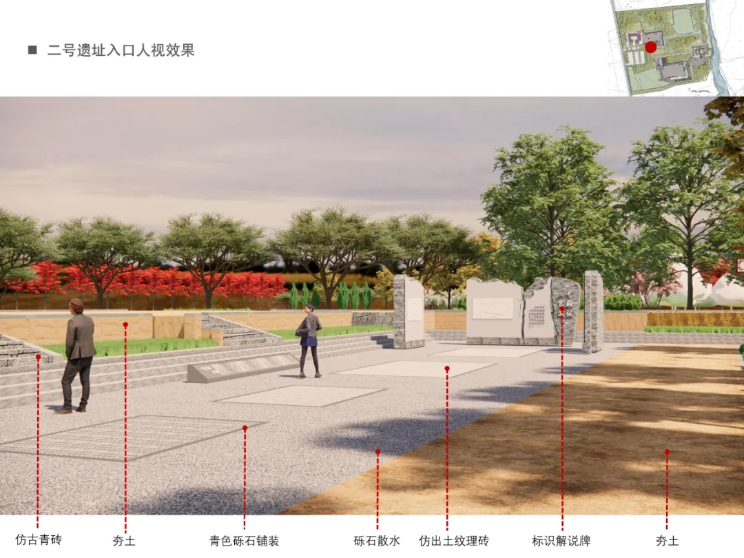 整个保护展示工程,将利用景观标识设计手段对不同宫殿遗址进行展示。对于经考古发掘实证信息明确的遗址,使用夯土、仿古砖等材料予以重点、详细展示(一二三号宫殿遗址考古发掘部分),针对经考古勘探,信息尚不明确的遗址,使用绿植、草皮等材料做标识展示(三号、五号遗址考古勘探部分)。