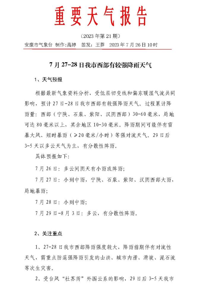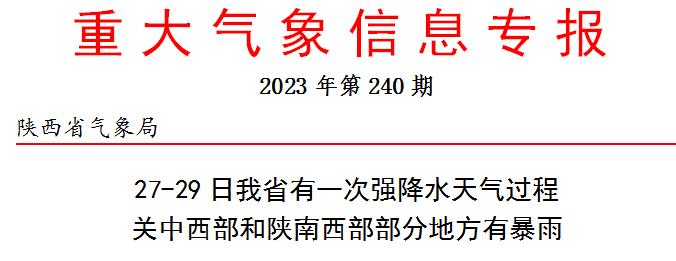 根据气象部门预报,受低层切变线和偏东暖湿气流共同影响,7月27日至29日陕西大部分地区有一次强降水天气过程,关中西部和陕南西部部分地方有暴雨。主要降水时段在27日到28日。过程累计降水量:陕北北部10-40毫米,陕北南部、关中东部、陕南东部15-50毫米,局地可达70毫米以上;关中西部、陕南西部40-80毫米,局地可达120毫米以上。降水期间伴有雷暴,局地有短时大风、短时暴雨(20~40毫米/小时,局地可达50毫米/小时以上)等强对流天气。陕西省防汛抗旱总指挥部下发通知,要求做好强降水防范工作。
