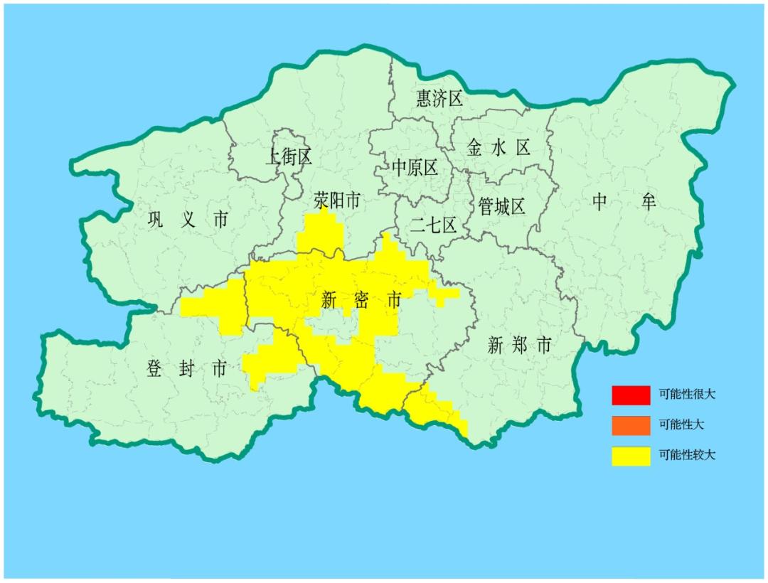 据郑州气象,今晚到明天,郑州市地质灾害气象风险预警达到黄色预警的地区为:新密大部,新郑西南部,登封东北部,荥阳南部局部,该区域内发生地质灾害的可能性较大。