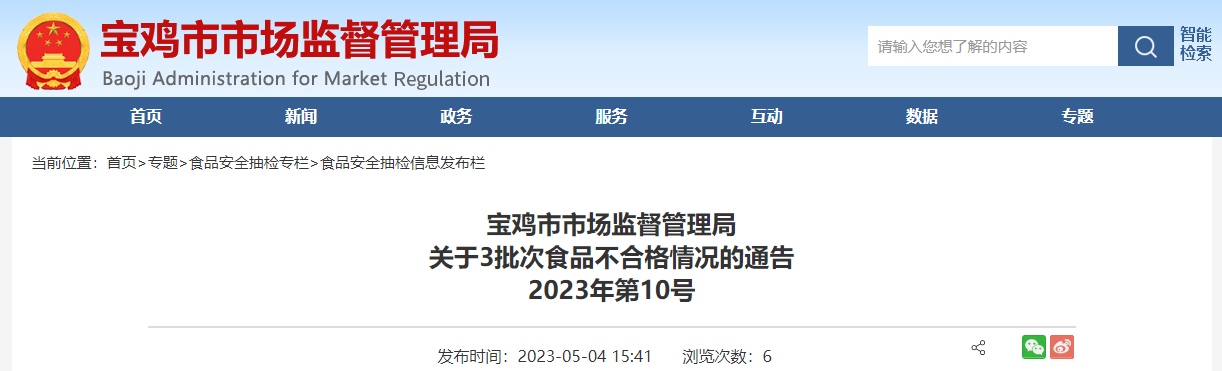 陕西省宝鸡市市场监管局关于3批次食品不合格情况的通告(2023年第10号)