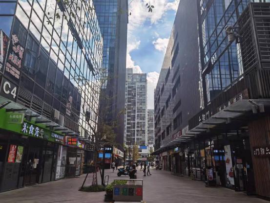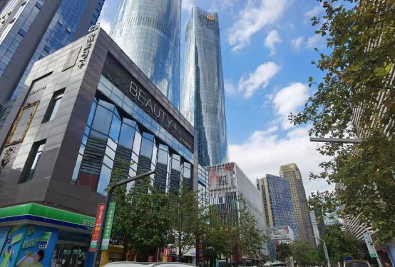 附近是绿地缤纷城,聚集了许多商铺,高楼林立,人流较大。
