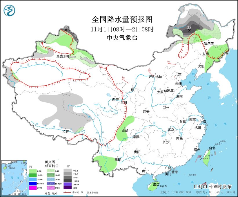 11月1日08时至2日08时,内蒙古东部、黑龙江西北部、新疆北部和西部、西藏北部和东部、青海西部等地部分地区有小到中雪或雨夹雪,其中,新疆阿勒泰地区、内蒙古东北部等地局地有大到暴雪(10~12毫米);黑龙江西南部、吉林东部、辽宁东北部、新疆北部、四川中部、云南西南部、海南岛、台湾岛等地部分地区有小雨。内蒙古中西部、河北北部等地部分地区有4~6级风(见图1)。