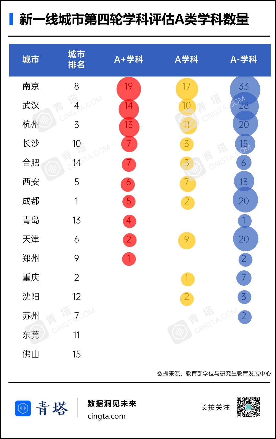剩下城市中,长沙、合肥、西安、成都、青岛、天津、郑州等,拥有的A+学科数和A类学科总数表现中规中矩。
