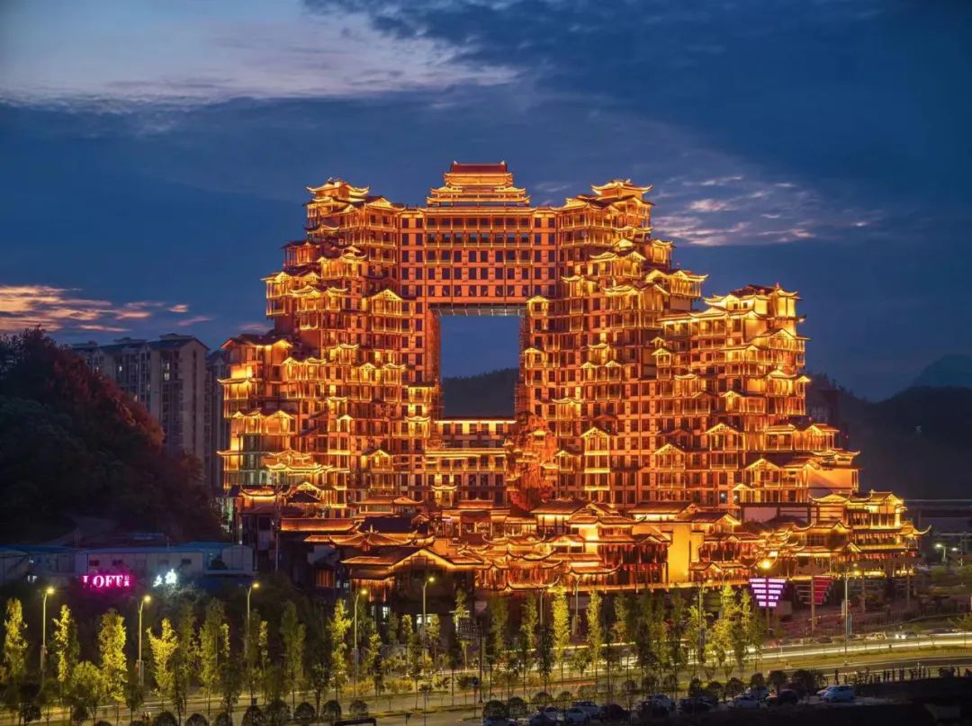 张家界新文化地标、109.9米土家族吊脚楼世界基尼斯第一高楼——张家界七十二奇楼。七十二奇楼分为天宫奇楼、烟火老街、七十二奇寨三大板块,涵盖酒吧街、作坊街、博物馆群等多种休闲业态,吃喝玩乐购应有尽有。这里还有全球最新的7D全息影像与吊脚楼集群的飞檐翘角巧妙结合,呈现72种美轮美奂的主题灯光演艺秀,打造一场精美绝伦的视觉盛宴。