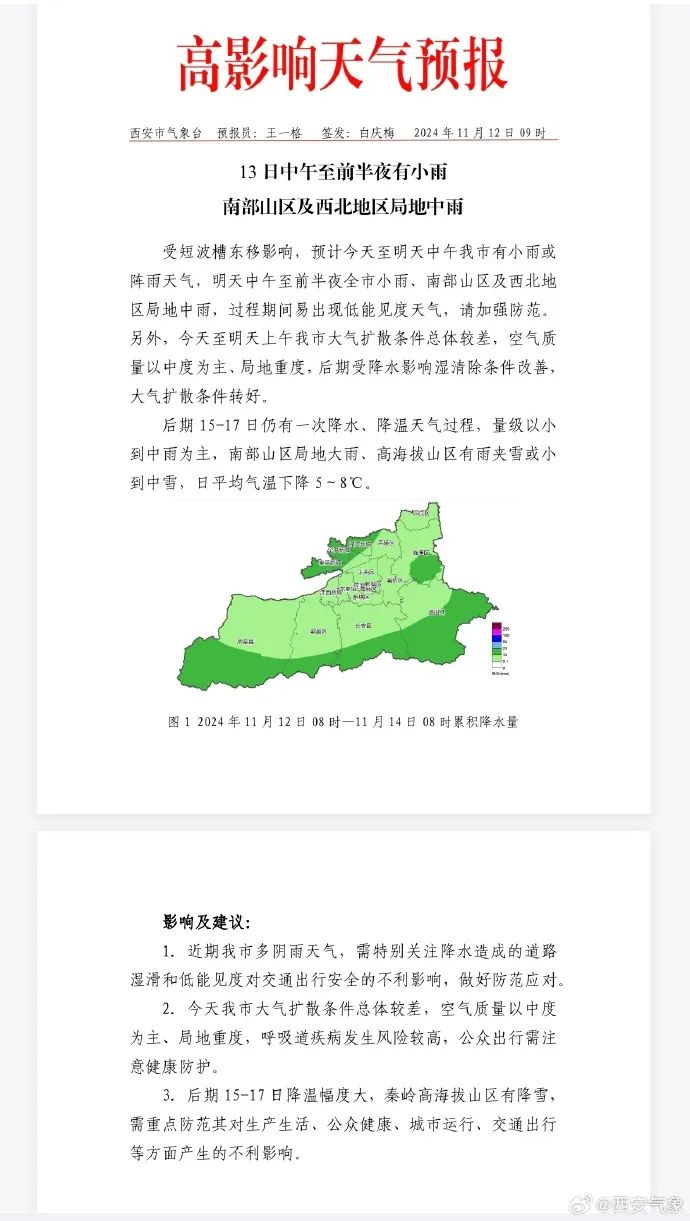 3.后期15-17日降温幅度大,秦岭高海拔山区有降雪,需重点防范其对生产生活、公众健康、城市运行、交通出行等方面产生的不利影响。