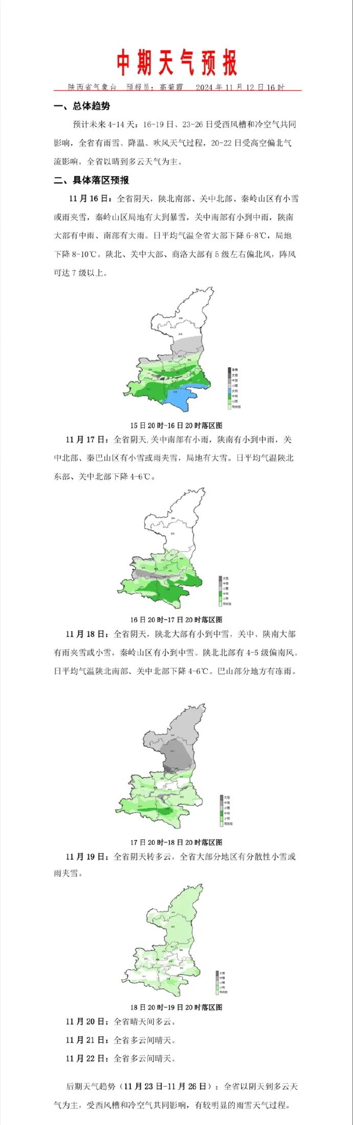 16日:阴天有小到中雨,秦岭高海拔山区有雨夹雪或小到中雪,8℃~11℃;