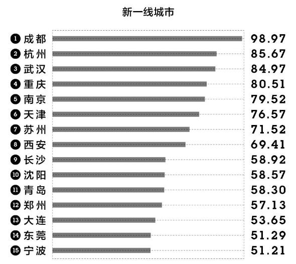 北上广深4个一线城市的地位依然不可动摇,但15个“新一线”城市的席次有了一些改变,依次是成都、杭州、武汉 、重庆、南京、天津、苏州、西安、长沙、沈阳、青岛、郑州、大连、东莞和宁波。