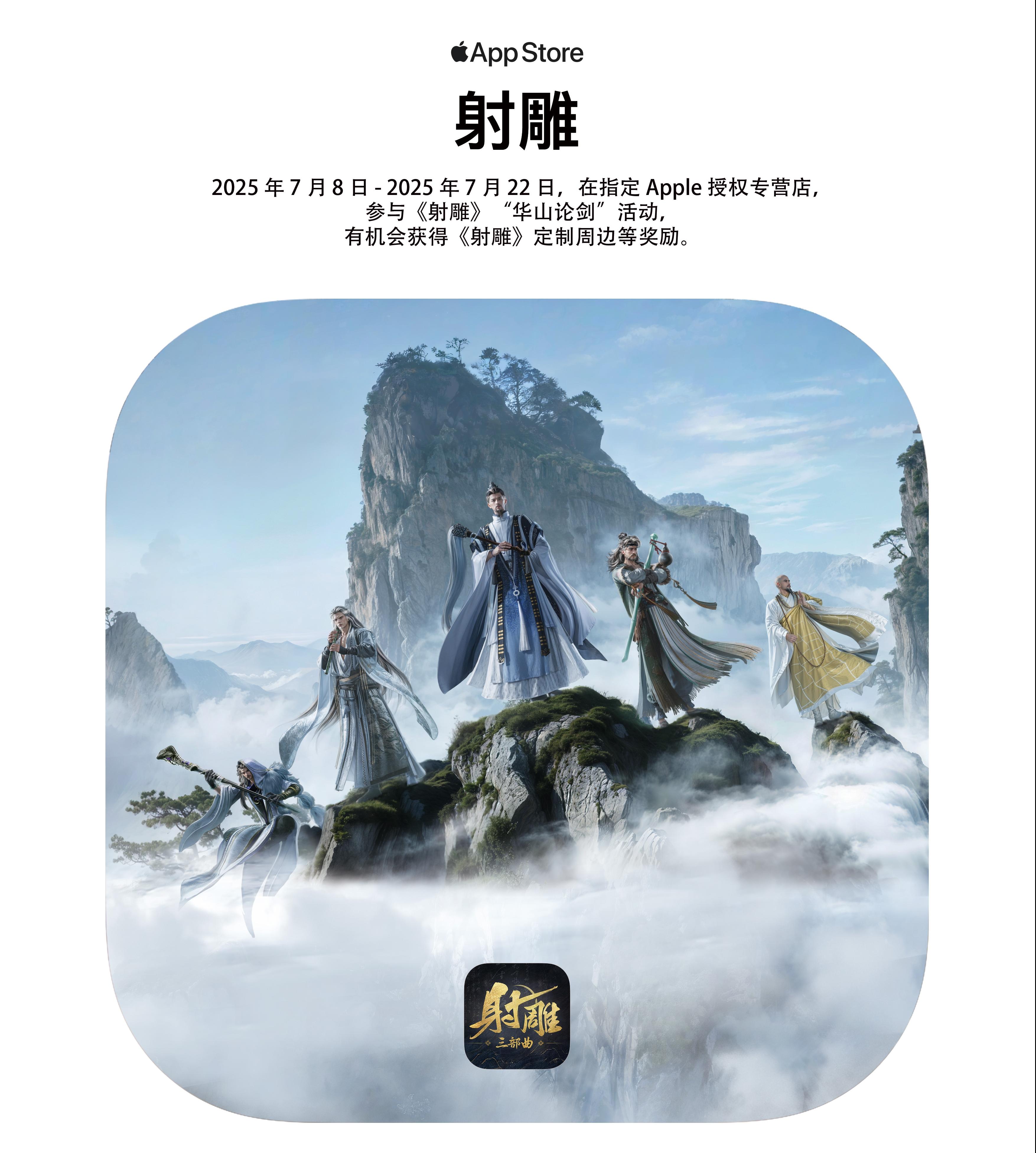 7月8日至7月22日,网易旗下的经典武侠IP游戏《射雕》与 Apple 授权专营店达成重磅合作,共同开启 “华山论剑” 线下主题活动,为玩家带来沉浸式自由武学真金庸的武侠体验,邀请广大玩家共赴华山之巅。此次联动共计覆盖全国600+座城市 Apple 授权专营店,以金庸武侠文化为核心,通过科技与经典武侠的碰撞,为玩家打造一场沉浸式的江湖盛宴。