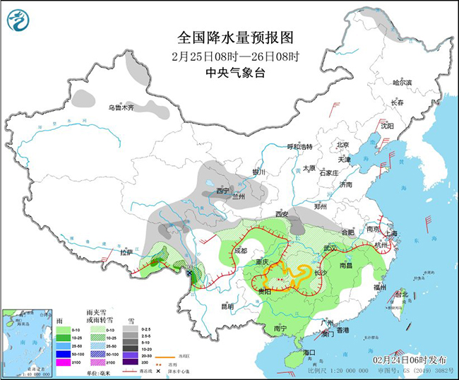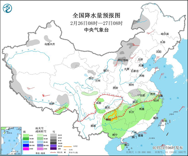 图5 全国降水量预报图(2月25日08时-26日08时)