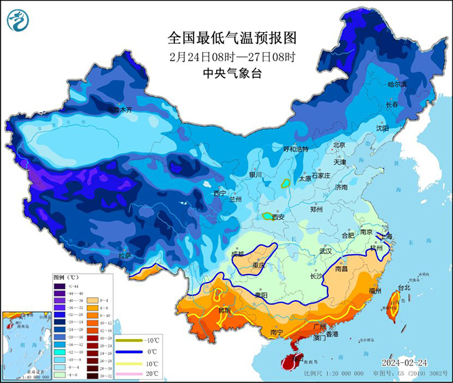 未来一周,我国大部地区气温将持续偏低。预计,2月24日08时至27日08时,江淮中西部、江汉大部、江南中部和西部、西南地区东部和北部、广西、广东北部以及陕西东南部、甘肃东南部、新疆沿天山地区、西藏南部等地的日平均气温较历史同期偏低5℃以上,其中,湖北中部和南部、湖南大部、江西中部、贵州大部、广西中北部、四川中西部、新疆沿天山地区等地的日平均气温较历史同期偏低7℃以上(见图1),最低气温0℃线将位于贵州西南部、广西北部、江西北部至江苏南部一带(见图2)。中央气象台2月24日06时继续发布低温黄色预警。