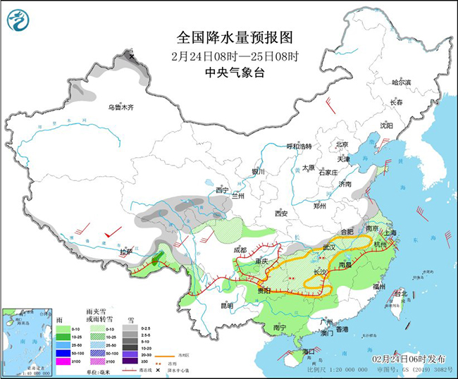 2月24日08时至25日08时,新疆北部和伊犁河谷、西藏东部、青海南部、川西高原北部、山东半岛、江苏大部、安徽中南部、湖北东部和南部、湖南、贵州中北部等地的部分地区有小到中雪或雨夹雪。江南中东部、四川盆地北部、华南中西部、海南岛东部和北部、贵州西南部、云南北部、西藏东南部等地有小到中雨。辽东半岛、山东半岛、浙江北部和东部、川西高原、西藏中东部等地的部分地区有4~6级风,西藏中部、川西高原的部分地区风力可达7级以上(见图4)。黄海大部、东海大部、台湾海峡、台湾以东洋面、南海大部海域、北部湾将有6~7级风,阵风8级。