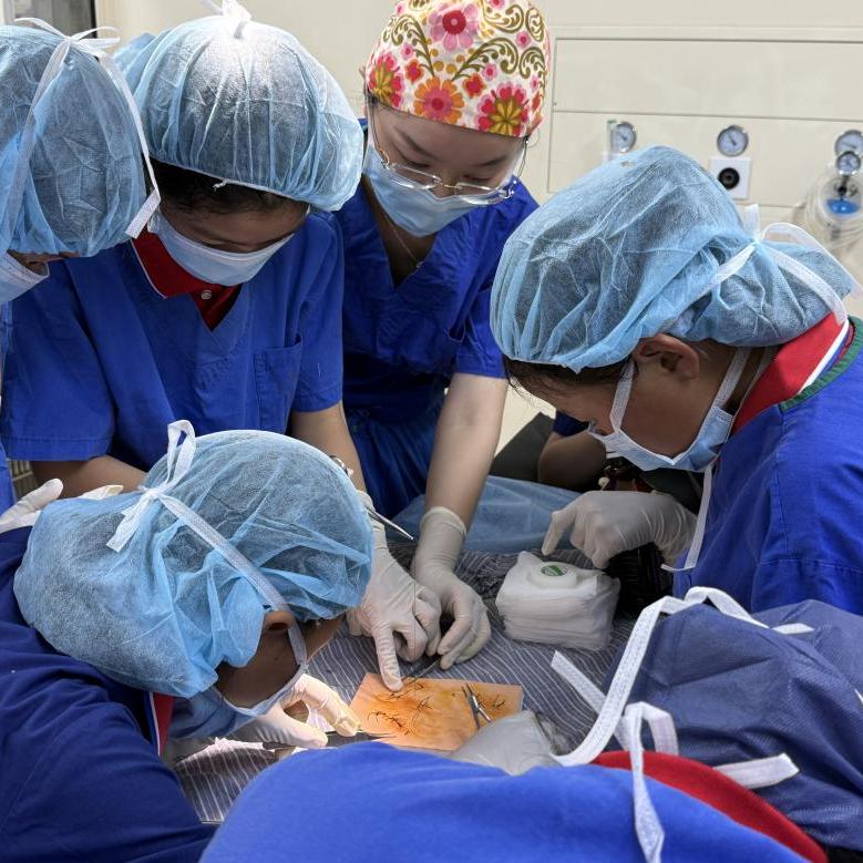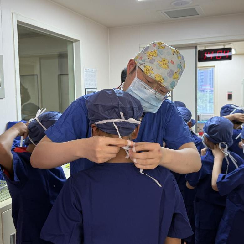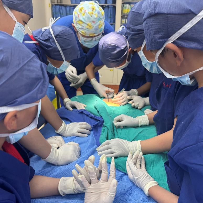 在整形外科手术室,陈凌枫主治医师向同学们介绍了手术室的基本组成,讲解了如何正确穿戴手术服、帽子、口罩以及如何洗手、消毒。实操环节,陈凌枫主治医师和潘思妲主治医师讲解了整形外科基础伤口缝合技术,“小医生”们亲自体验了缝合、拆线等操作,并有两名“小医生”被评选为“最佳缝合技术奖”。
