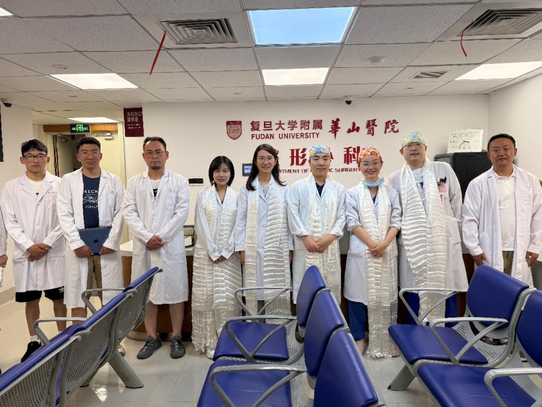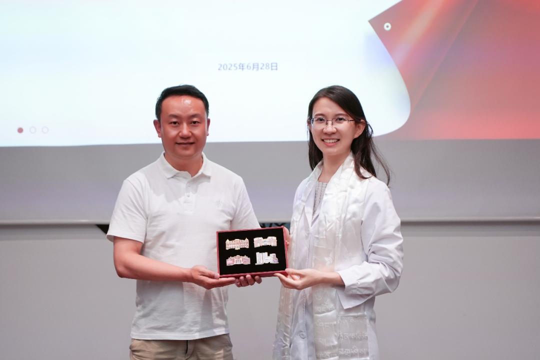 来自青海省果洛州的老师们为华山医院科普创新实验室的讲师们献上洁白的哈达,吴文斐副书记也回赠由华山医护人员亲手设计的文创——印有华山医院各个院区建筑的冰箱贴。