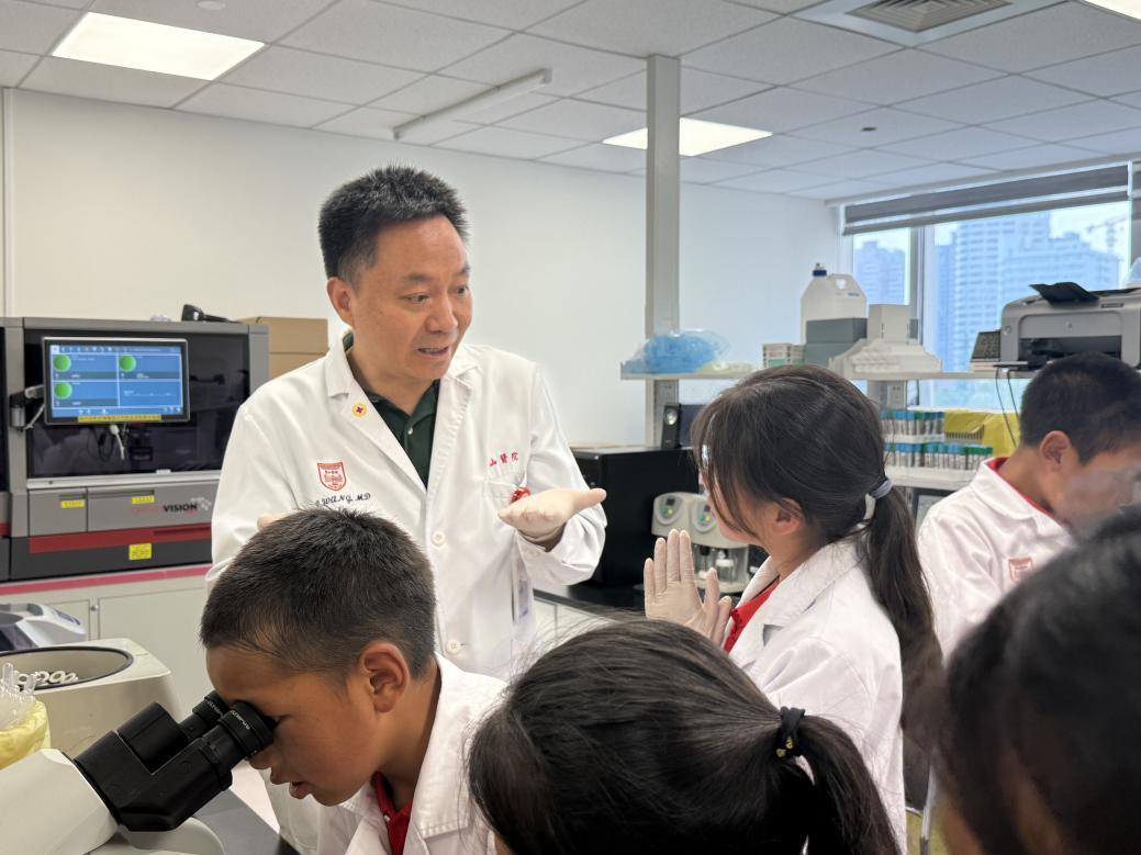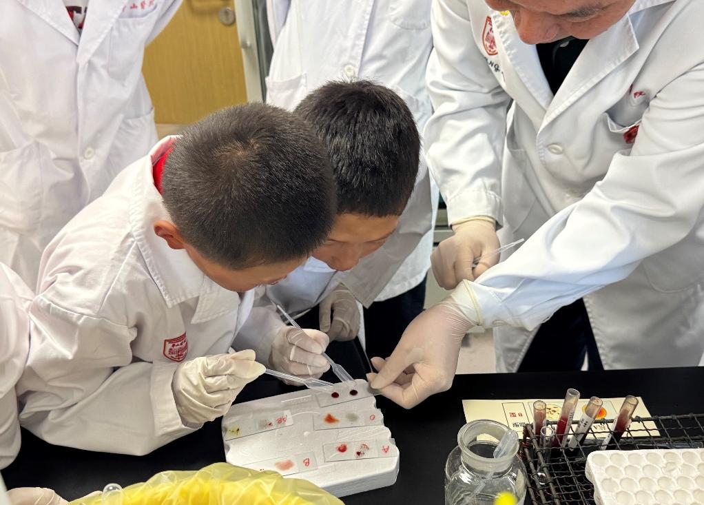 在输血科,王志成主任技师和卢煌莹技师带领同学们从ABO血型系统的遗传密码到血型测定实验,为孩子们揭开血细胞的秘密。