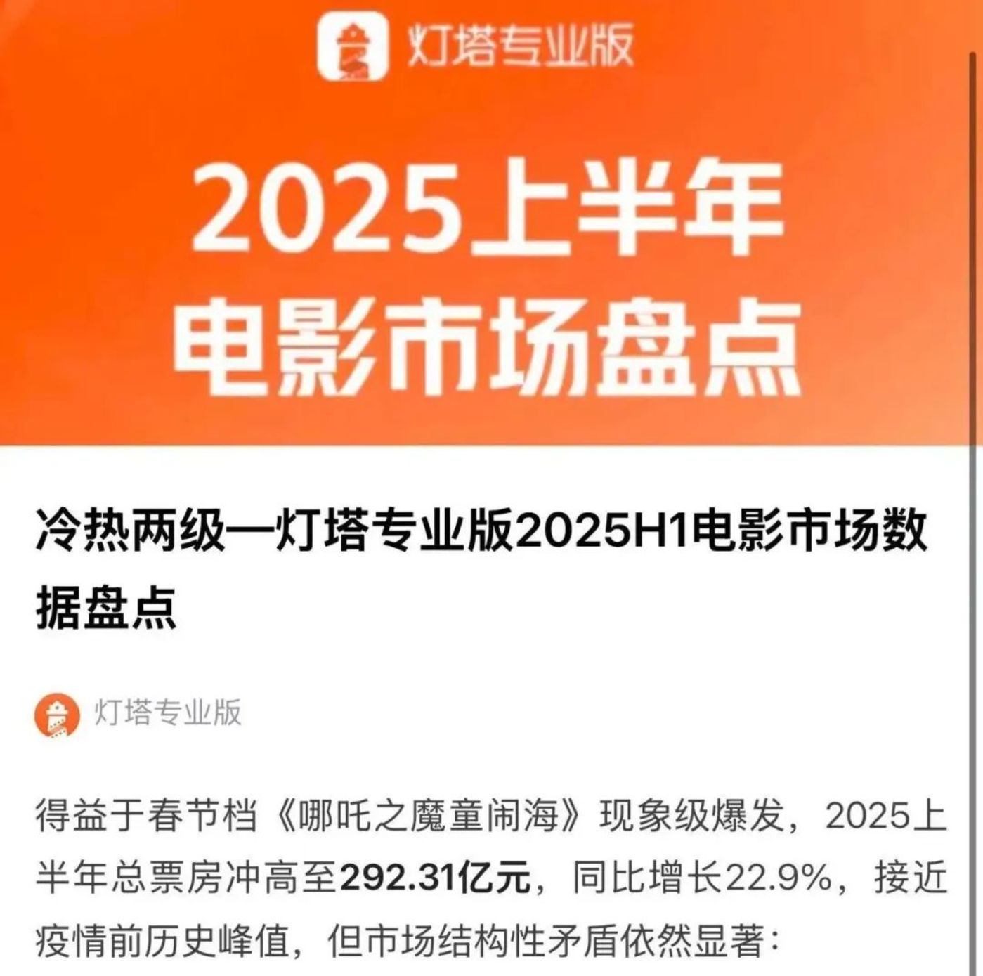 上半年票房292亿元,电影正市场加速复苏随着《哪吒2》引爆的开年佳绩,2025年电影市场正在从缓慢的复苏节奏加快步伐。根据灯塔专业版数据,2025年上半年中国电影市场总票房:292.31亿元(同比增长22.91%),为2020年以来最佳上半年表现,历史排名第三(仅次于2018、2019年)。