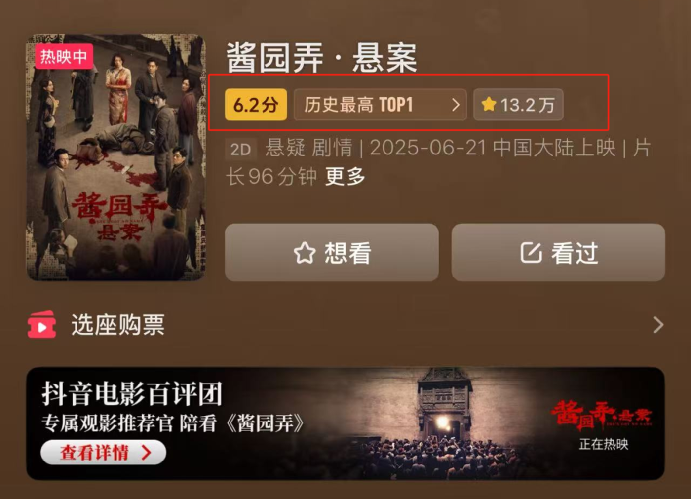作为2025年最值得期待的电影第二名,《酱园弄》抖音评分6.2,豆瓣评分5.7,真实评论可以看到观众对电影的观看,差距不大。“章子怡确实很好,好到在这个片子里都有些浪费了……大花野心犹在,但时势已经造不出英雄了。”“杨幂演技竟然是最好的,另外除了杨幂这个角色有人物弧光外,其他的角色都在干啥啊?赵丽颖这次怎么拉垮成这样”一位朋友对文娱价值官说,就是因为太多人说这部电影难看,反而引发了她去电影院一看究竟的冲动。
