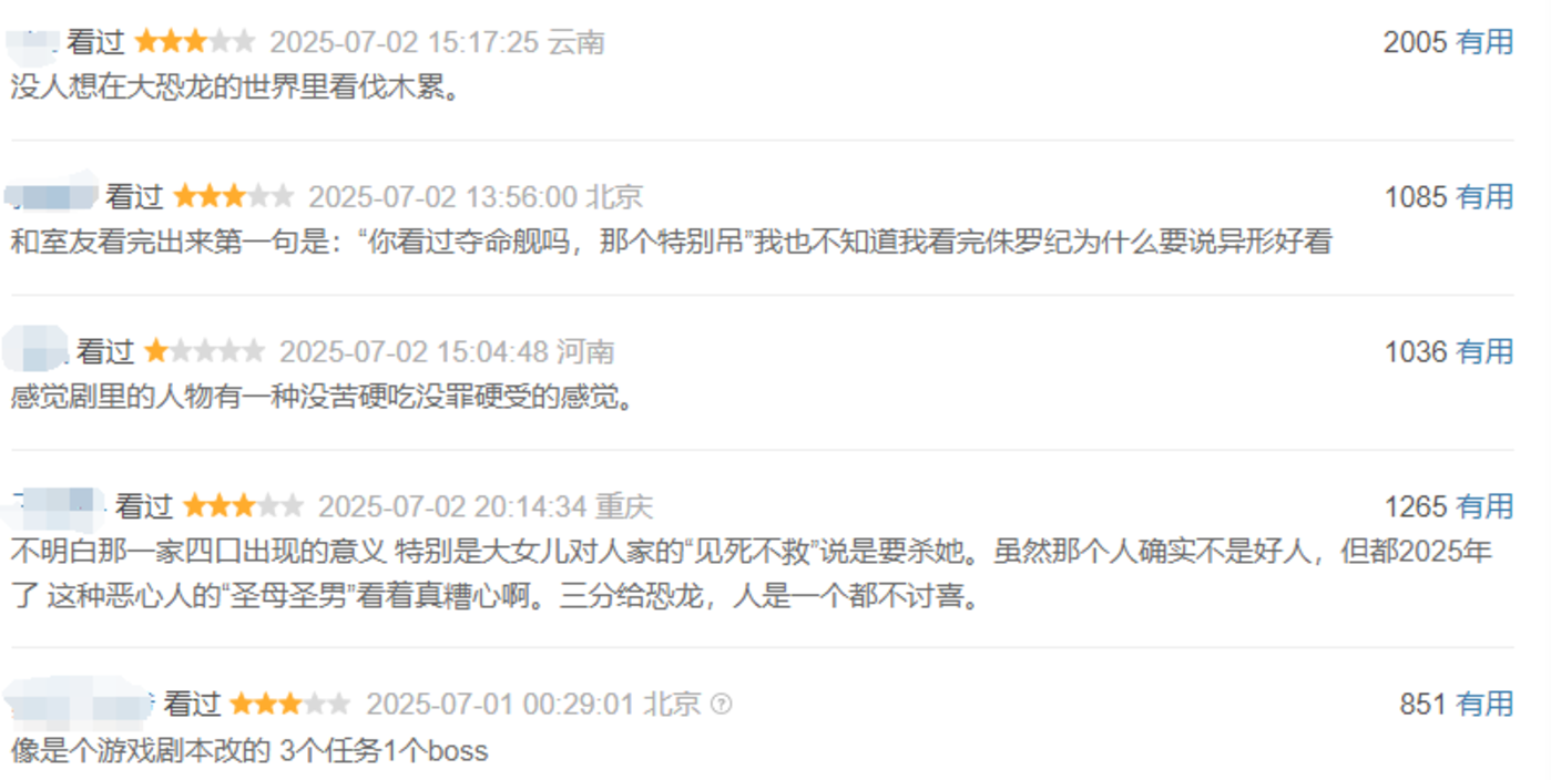 文娱价值官在《侏罗纪世界:重生》抖音电影评分下,看到目前已有2.1位万用户给出评分,并对影评进行评论。其中给出五分的观众认为“电影给我带来很多惊喜,充满诚意,电影里出现从小熟悉的恐龙品种。”“ 也有观众表示“本想出于情怀给4分,但介于对电影的尊重,还是只能打三分。”“看IMAX版本太过瘾了!”虽然不同的观众有不一样的观感,但是抖音电影评分区里热烈的讨论,的确能带动更多观众的观影热情。