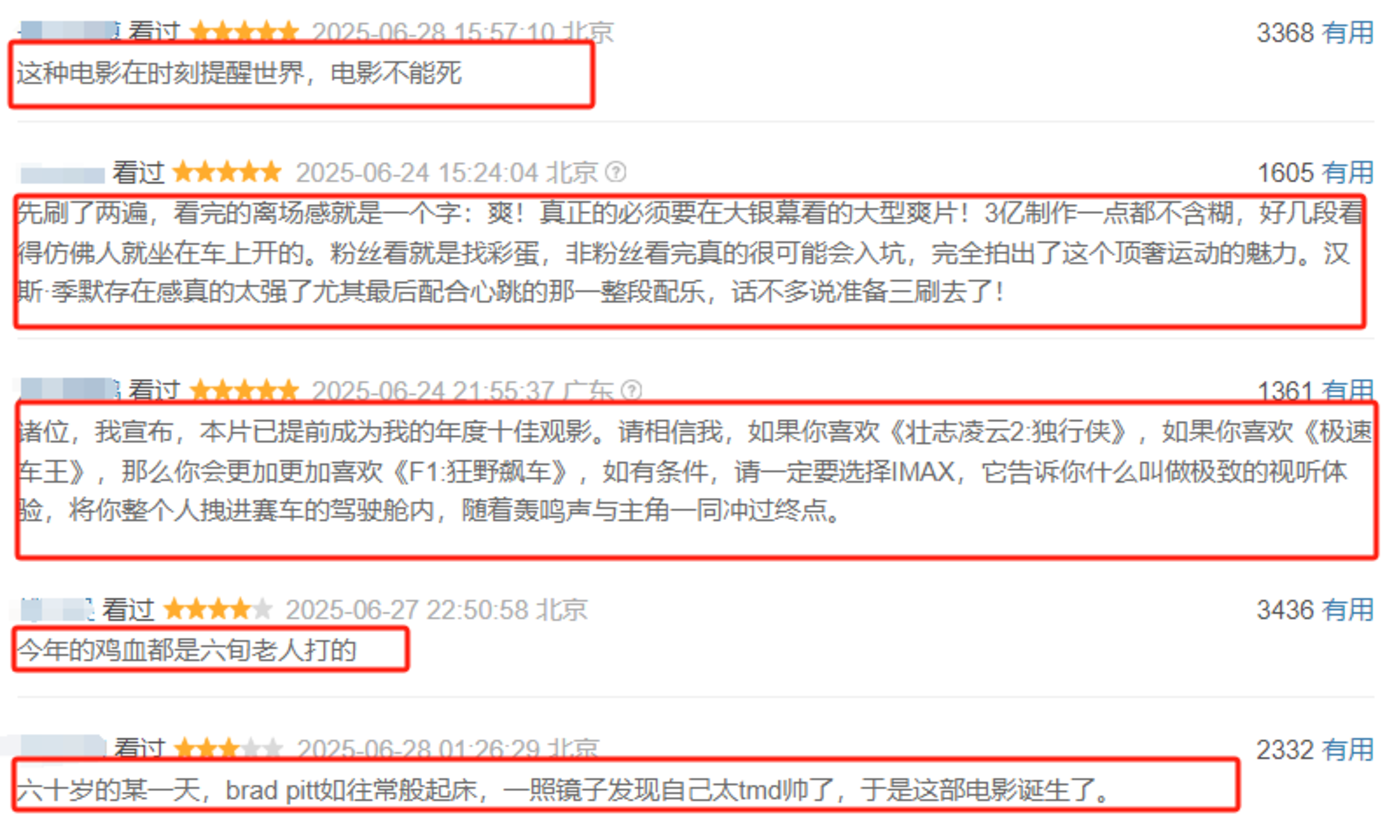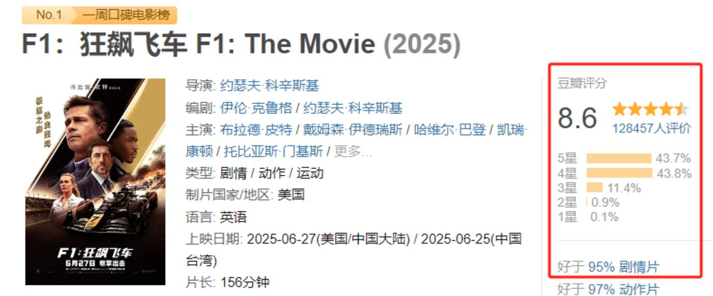 《F1:狂飙飞车》是口碑带动票房飞起的典型案例,截止7月8日,该片国内累积票房1.75亿,场次占比位居第四。其实,《F1:狂飙飞车》刚上映时并没有溅起太大水花,随着口碑发酵和营销传播,才受到更多观众的关注。