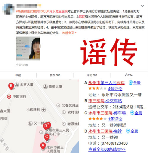【真相】9月20日,永州市第三人民医院通过官网发布声明澄清,经院方仔细查询核对,此女不是本院工作人员,并表示网络盛传的谣言对院方造成了很大的负面影响。另外,网传的“冷水滩三医院”也并不存在。