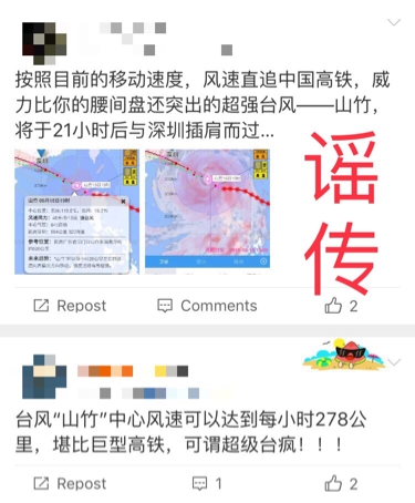 【传闻1】有网民发消息称,“山竹”中心风速高达每小时278公里,速度堪比中国高铁。