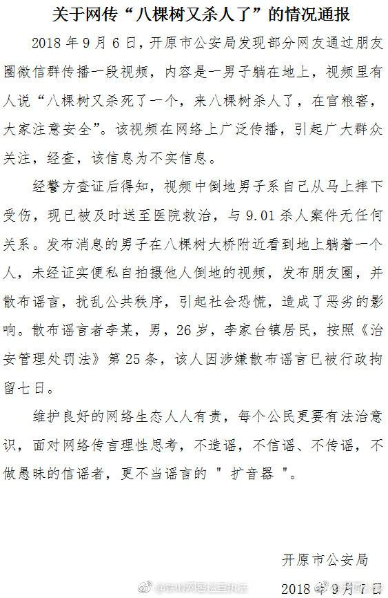 【真相】据当地媒体报道,9月1日深夜,铁岭开原市八棵树镇叶家村发生一起特大刑事案件。对于网传“八棵树又杀人了”视频,经警方查证后得知,此消息不实。视频中倒地男子系自己从马上摔下受伤,已被及时送至医院救治,与“9.01杀人案件”无任何关系。发布消息的男子李某私自拍摄他人倒地的视频,发布朋友圈,并散布谣言,引起恐慌,造成恶劣影响。按照《治安管理处罚法》第25条,李某因涉嫌散布谣言已被行政拘留七日。