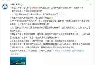 【传闻2】近日,网上流传一条消息称,港珠澳大桥可能抵挡不住台风“山竹”。港珠澳大桥可抵挡最高风力为16级,而台风“山竹”风力高达17级。