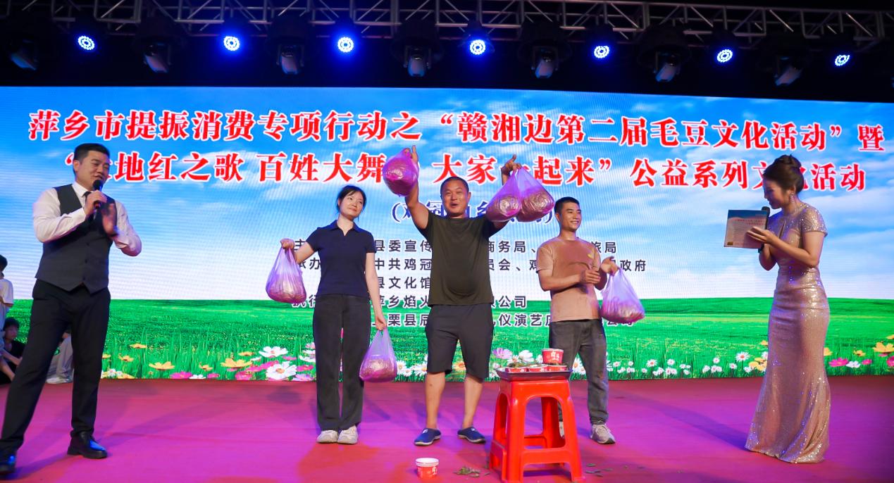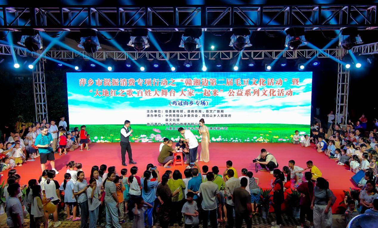 彩旗飘扬,豆香扑鼻。6月6日,萍乡市提振消费专项行动之“2025年赣湘边第二届毛豆文化活动”暨“大地红之歌百姓大舞台大家一起来”公益系列文化活动(鸡冠山乡专场)在豆田农博园盛大启幕。活动为期5天,以“豆”为媒,搭建沉浸式农文旅融合平台,吸引周边市县的市民、游客共赴一场烟火之约,成为乡村文旅融合发展的亮眼范本。
