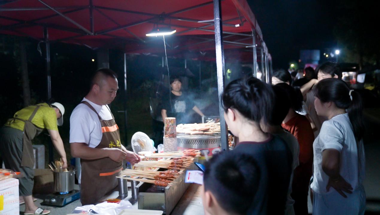 漫步在美食一条街上,烤串、臭豆腐、糖油粑粑等小吃散发出诱人的香气,让人垂涎欲滴。现场人头攒动,热闹非凡,游客们或品尝美食,或拍照留念,享受着这场舌尖上的盛宴。