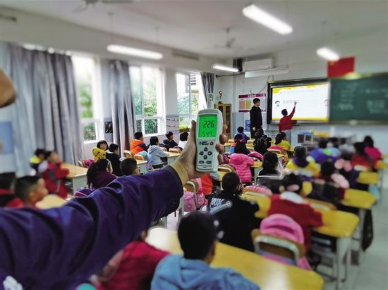 陕师大凤凰城小学进行提前供暖,测温仪显示室内温度达到22.6摄氏度。 本报记者 刘坤摄