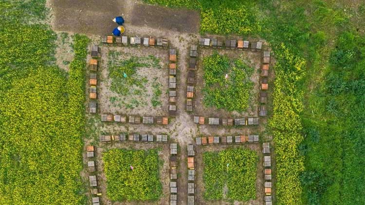 7月16日,在青海省海北藏族自治州门源回族自治县,吴凤明在检查蜂箱。在蜂群还未苏醒之时,一家人便开始了忙碌:查看蜂箱、采粉晾晒、收集蜂蜜、打包寄货。在蜂群还未苏醒之时,一家人便开始了忙碌:查看蜂箱、采粉晾晒、收集蜂蜜、打包寄货。