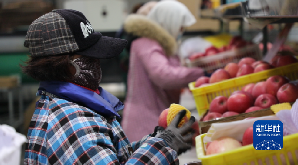 妇女们正在苹果分选中心包装苹果。(新华社记者张睿 摄)