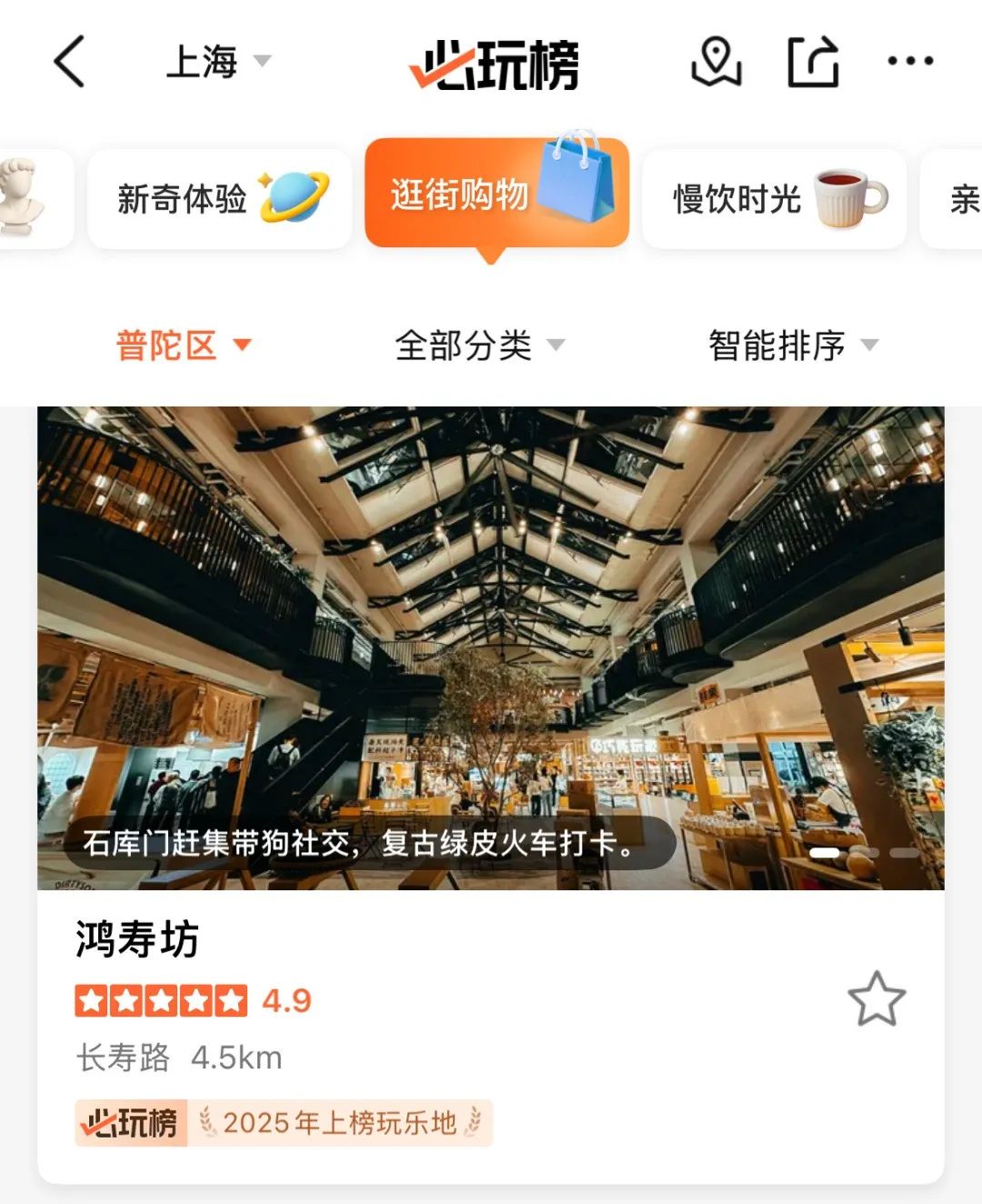 梳理榜单发现,鸿寿坊表现出色,以一家商场的身份同时获得“逛街购物”和“宠物友好”两大榜单“必玩榜”。商场内有25家商户还登上点评榜单各项排名。
