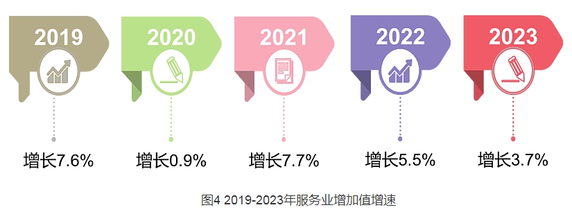 全年服务业增加值增长3.7%。从主要行业看:批发和零售业下降7.8%,交通运输、仓储和邮政业增长7.8%,住宿和餐饮业增长9.2%,金融业增长5.6%,房地产业增长1.2%,其他服务业增长2.6%。2023年规上服务业企业营业收入126.03亿元,比上年增长6.4%,利润总额增长44.8%。